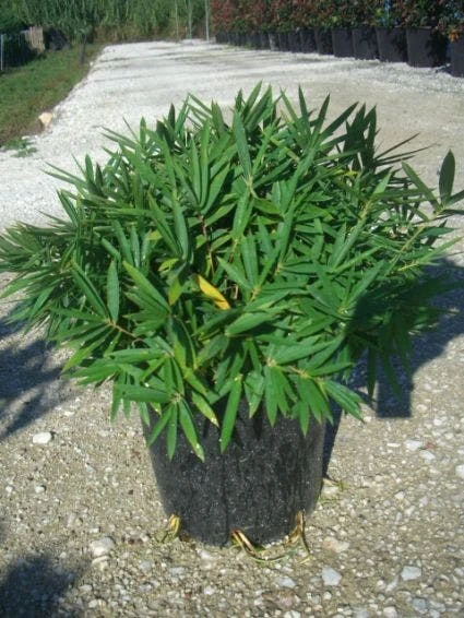 Pleioblastus pygmaeus (Bamboe) Sterkgroeiende decoratieve planten, die diep wortelen. Bladeren klein, groeiwijze opgaand(dwergvormig). Krachtig woekerende, wintergroene bamboe. Hoogte circa 80 cm. Vormt een bossige plant. Groen blad. Voor zon – schaduw. Groeit op elke grondsoort. Goed winterhard. Mag na de winter afgeknipt worden.